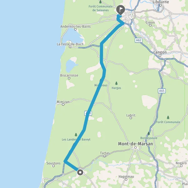 Au rond-point, prendre la 2ème sortie sur D947 (Route de Castets) et continuer sur 13 kilomètres