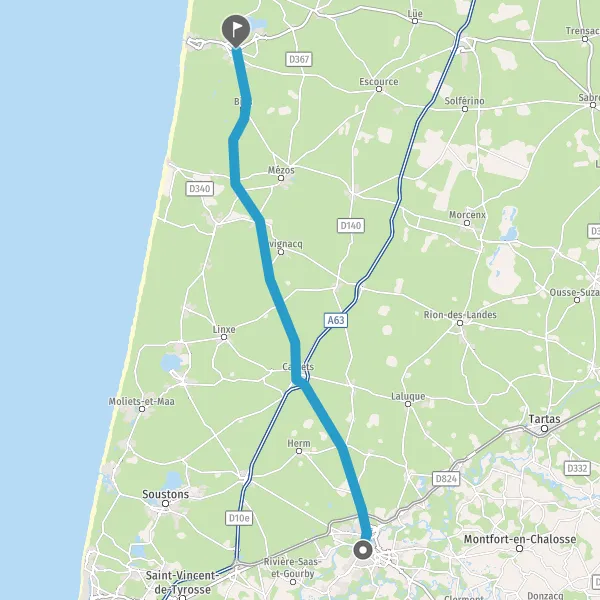 Au rond-point, prendre la 2ème sortie sur D947 (Route de Castets) et continuer sur 13 kilomètres