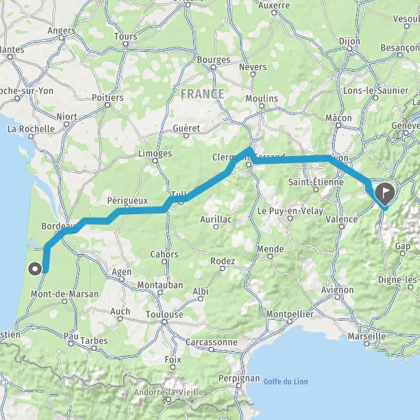 Prendre à droite et rejoindre A63 E5 E70. Continuer sur 61 kilomètres