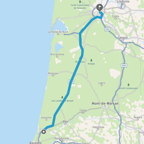 Avec le mode voiture, vous pouvez configurer vos options (type de véhicule, autoroute ou non, péage ou non, distance la plus courte), tout en ayant accès aux infos de circulation grâce à notre service d'info-trafic en temps réel. Ainsi faites des économies sur le coût ou la durée de votre voyage, en trouvant le trajet Bénesse-Maremne Bordeaux adapté à vos besoins.