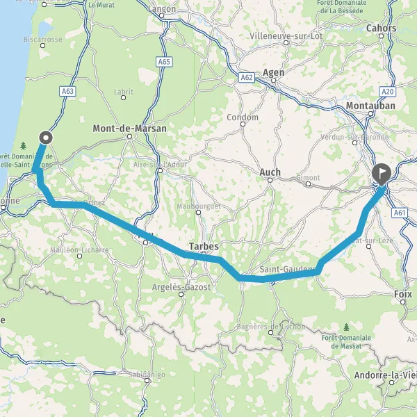 Prendre à droite et rejoindre A63 E5 E70. Continuer sur 22 kilomètres