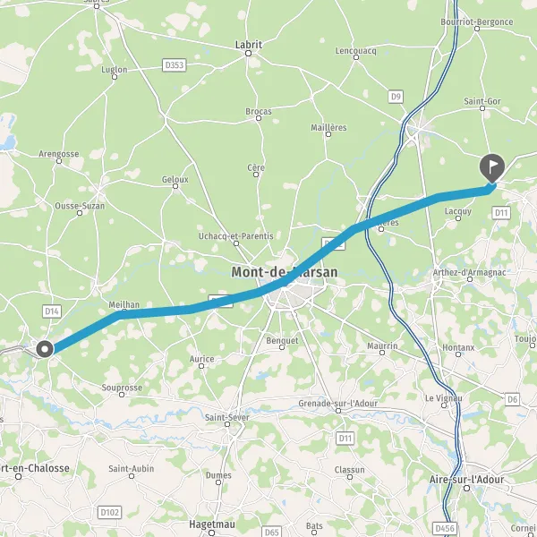 Prendre à droite et rejoindre D824 (Route de Mont-de-Marsan). Continuer sur 22 kilomètres