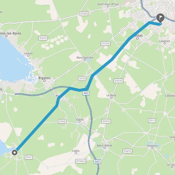 Prendre à droite et rejoindre A63 E5 E70. Continuer sur 15 kilomètres