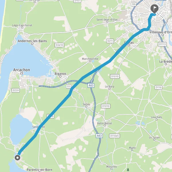 Prendre à droite et rejoindre A63 E5 E70. Continuer sur 21 kilomètres