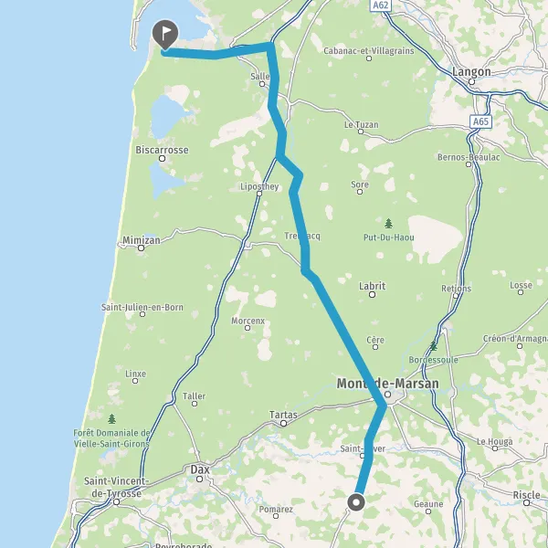 Tourner légèrement à droite sur D834 (Route de Pissos) et continuer sur 17 kilomètres