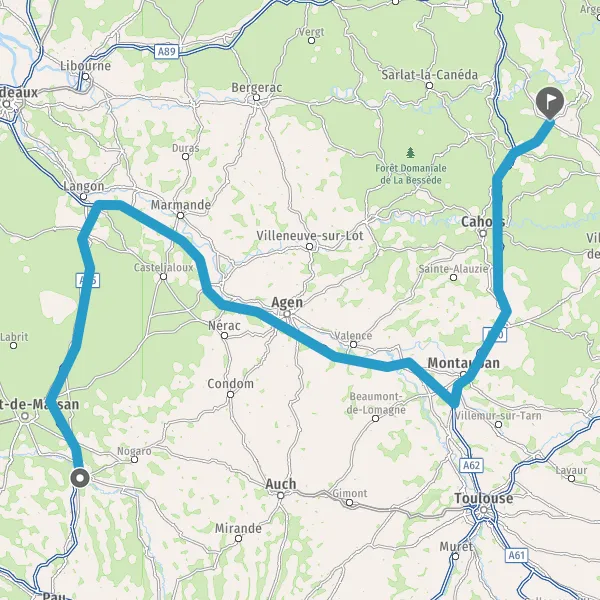 Prendre à droite et rejoindre A62 E72. Continuer sur 150 kilomètres