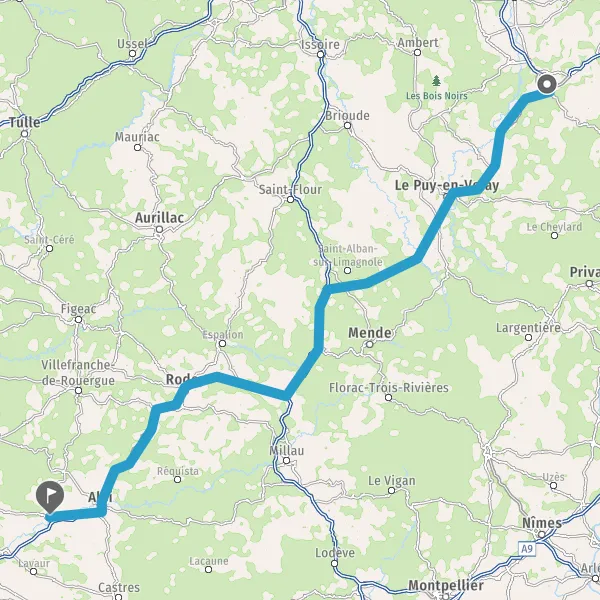 Tourner à droite sur D5 (Route de Saint-Chély) et continuer sur 16 kilomètres