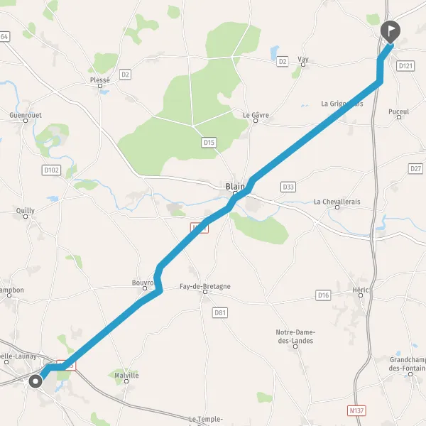 Au rond-point, prendre la 2ème sortie sur N171 (Route de Bouvron) et continuer sur 1,1 kilomètre