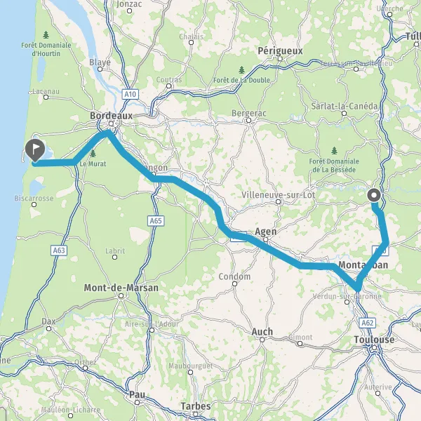 Prendre à droite et rejoindre A63. Continuer sur 25 kilomètres