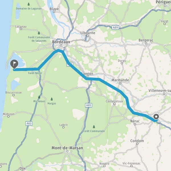 Prendre à droite et rejoindre A63. Continuer sur 25 kilomètres