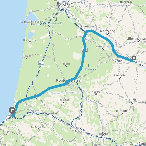 Prendre à droite et rejoindre A63 E5 E70. Continuer sur 33 kilomètres