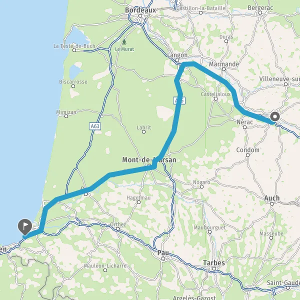 Prendre à droite et rejoindre A63 E5 E70. Continuer sur 44 kilomètres