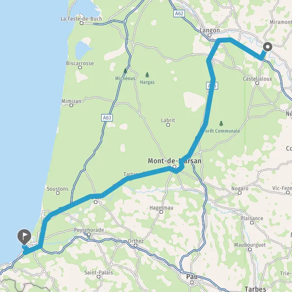 Prendre à droite et rejoindre A63 E5 E70. Continuer sur 44 kilomètres