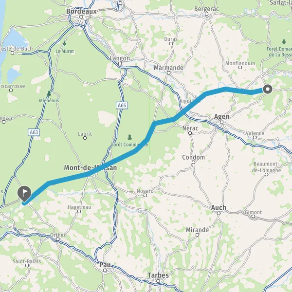 Au rond-point, prendre la 3ème sortie sur D933 (Route des Landes) et continuer sur 41 kilomètres