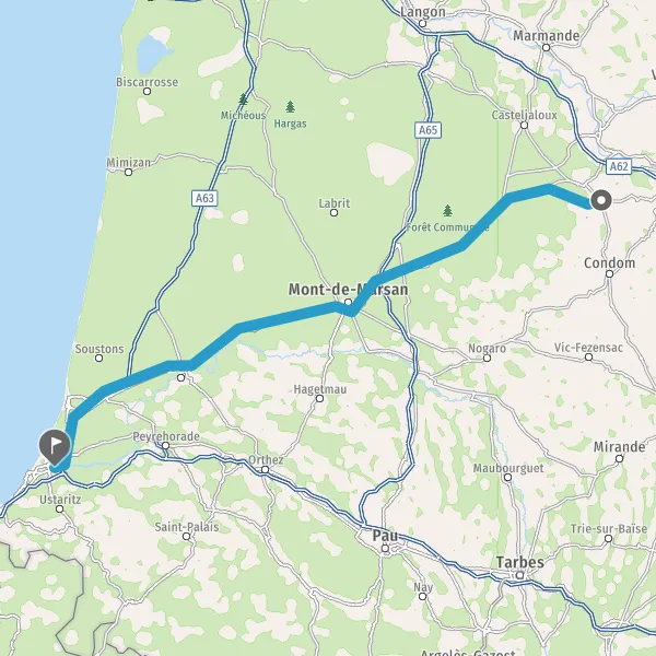 Prendre à droite et rejoindre A63 E5 E70. Continuer sur 33 kilomètres