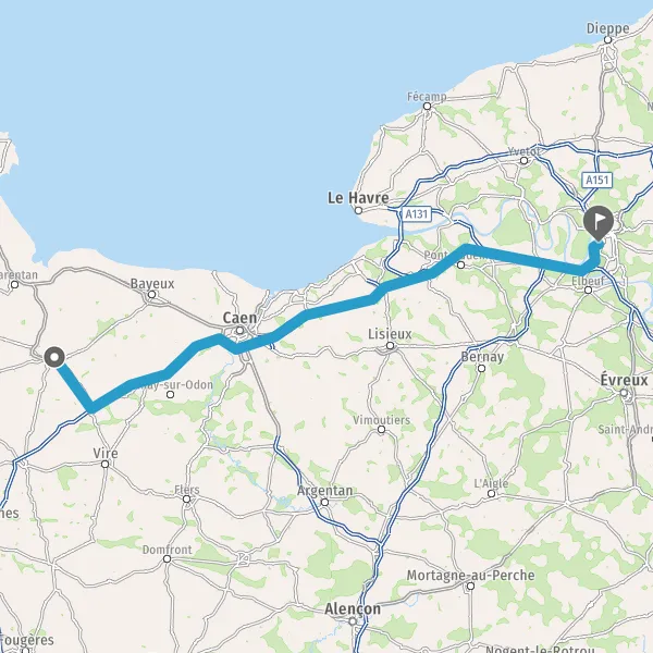 Prendre à droite et rejoindre A84 E401. Continuer sur 45 kilomètres