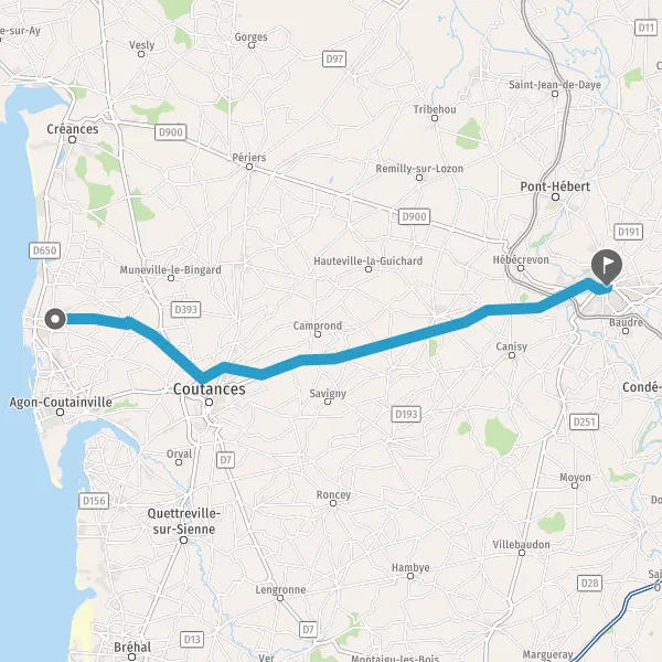 Au rond-point, prendre la 2ème sortie sur D900e3 (Route de Coutances) et continuer sur 650 mètres