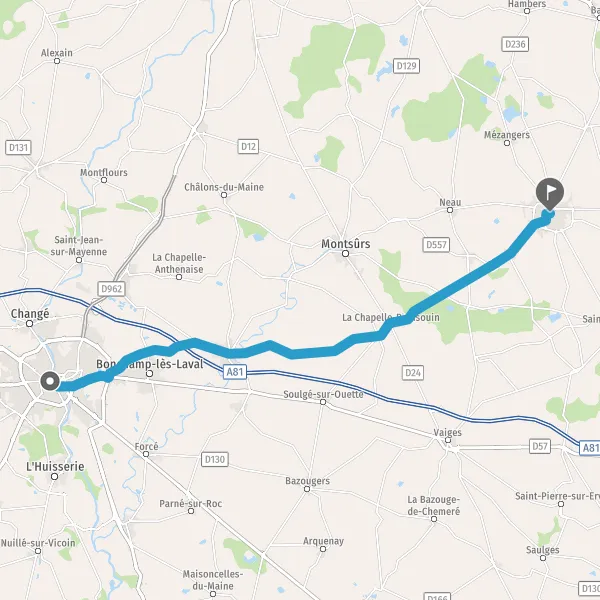 Au rond-point, prendre la 2ème sortie sur D20 (Rue des Coëvrons) et continuer sur 5,1 kilomètres