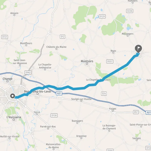 Au rond-point, prendre la 2ème sortie sur D20 (Rue des Coëvrons) et continuer sur 5,1 kilomètres