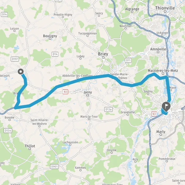 Au rond-point, prendre la 3ème sortie sur N3 (Rue de Metz) et continuer sur 5,5 kilomètres