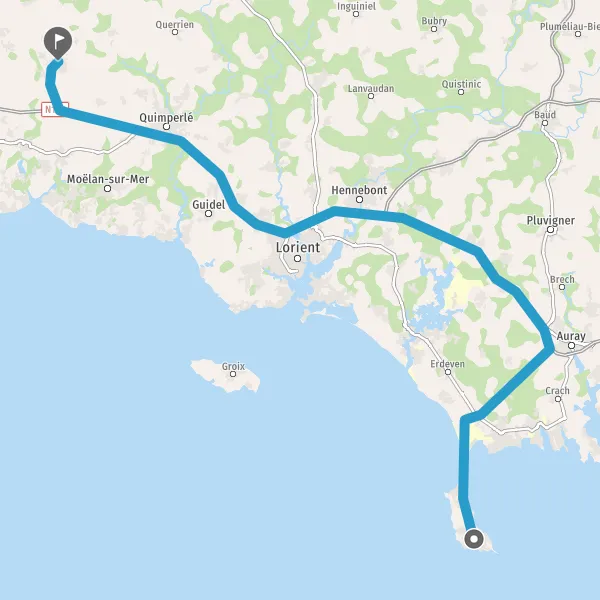 Au rond-point, prendre la 1ère sortie sur D768 (Route de Quiberon) et continuer sur 3,8 kilomètres