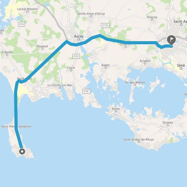 Au rond-point, prendre la 1ère sortie sur D768 (Route de Quiberon) et continuer sur 3,8 kilomètres
