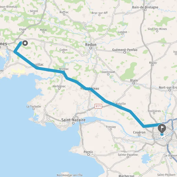 Prendre à gauche et rejoindre N165 E60 (Voie Express Lorient-Nantes). Continuer sur 63 kilomètres