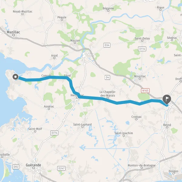 Au rond-point, prendre la 2ème sortie sur D34 (Route de La Roche-Bernard) et continuer sur 2,8 kilomètres