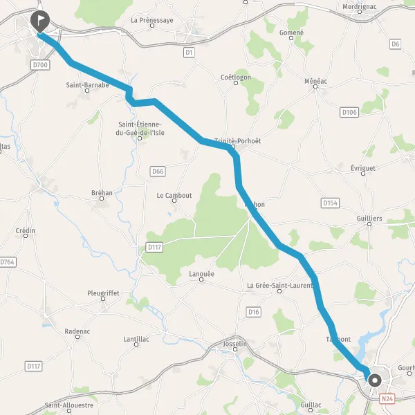 Au rond-point, prendre la 3ème sortie sur D8 (Avenue du Porhoët) et continuer sur 14 kilomètres