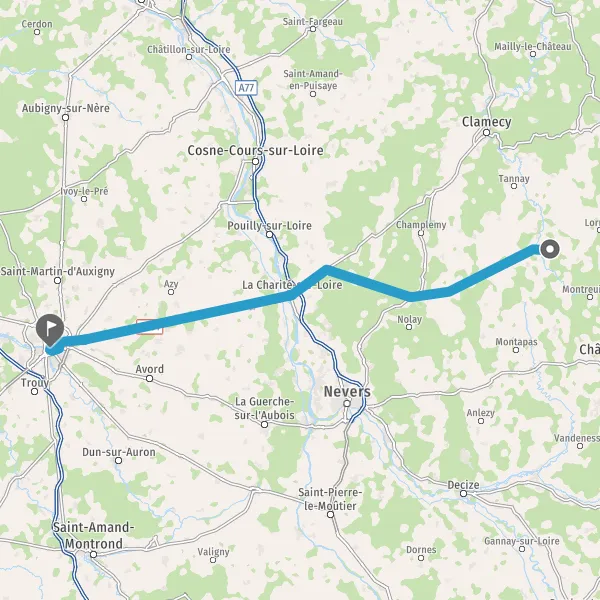 Tourner légèrement à droite sur N151 (Rue de la Charité Sur Loire) et continuer sur 33 kilomètres