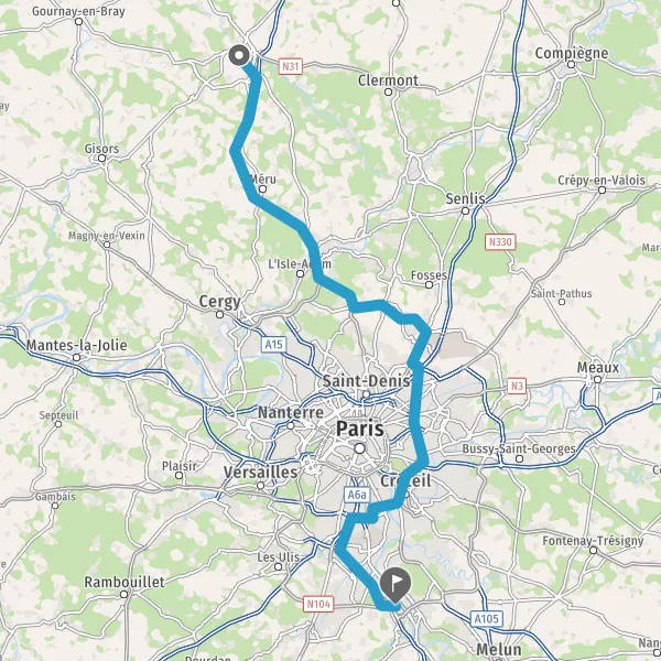 Prendre à droite et rejoindre N104 (La Francilienne). Continuer sur 1 kilomètre