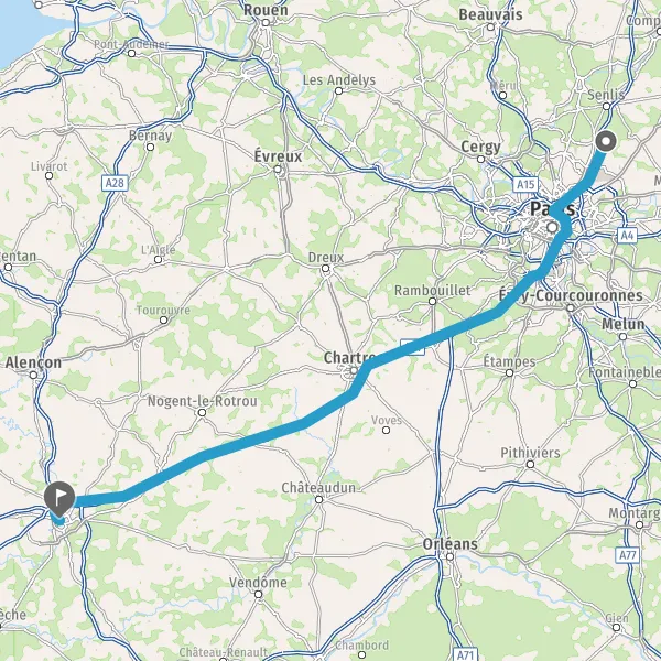 Itinéraire en voiture de Plailly 60128 à Le Mans 72000-72100