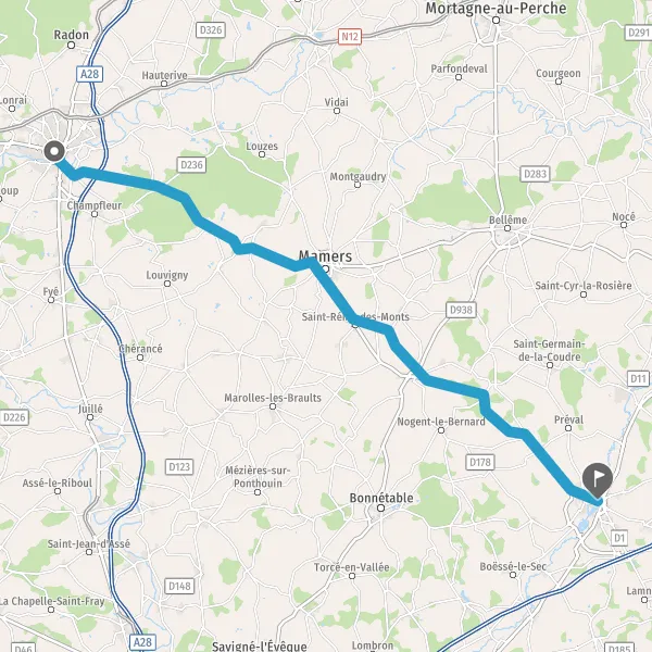 Tourner légèrement à droite sur D2 (Route de Mamers) et continuer sur 1,1 kilomètre