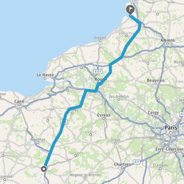 Prendre à droite et rejoindre A28 E402. Continuer sur 125 kilomètres