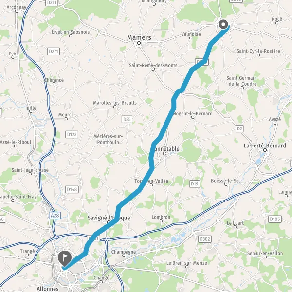 Au rond-point, prendre la 2ème sortie sur D301 (Rue de Bonnétable) et continuer sur 1,8 kilomètre