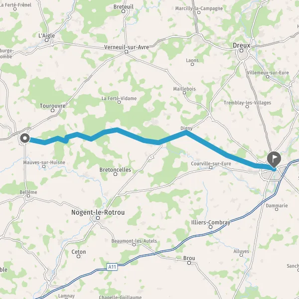 Tourner à droite sur D8 (Rue de Longny) et continuer sur 17 kilomètres