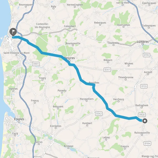 Tourner à droite sur D343 (Route de Desvres) et continuer sur 4,5 kilomètres