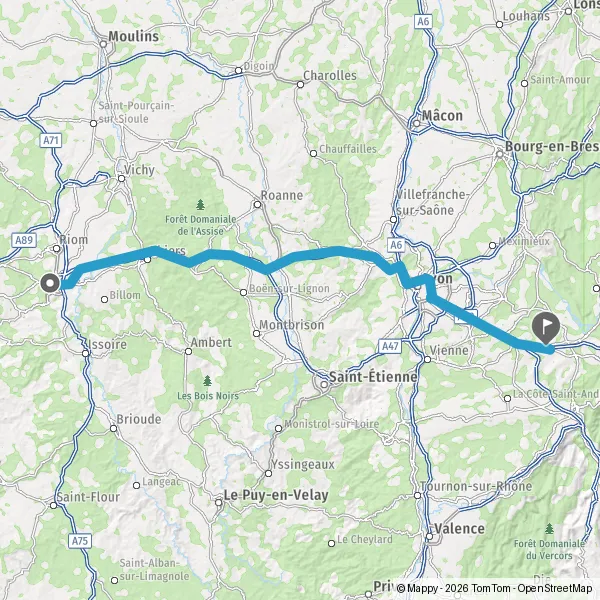 Continuer A89 E70 sur 77 kilomètres
