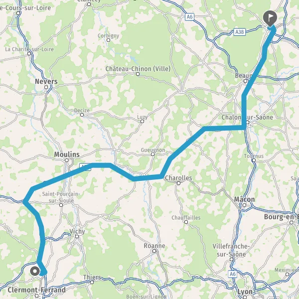 Payer 5,50 € (Péage Deux chaises) Prendre un ticket (Péage Le Montet Ouest) Payer 1,00 € (Péage Le Montet Est) Prendre un ticket (Péage Montbeugny Ouest) Payer 1,90 € (Péage Montbeugny Est) Prendre un ticket (Péage Molinet Ouest) Payer 1,30 € (Péage Molinet Est) 66 km