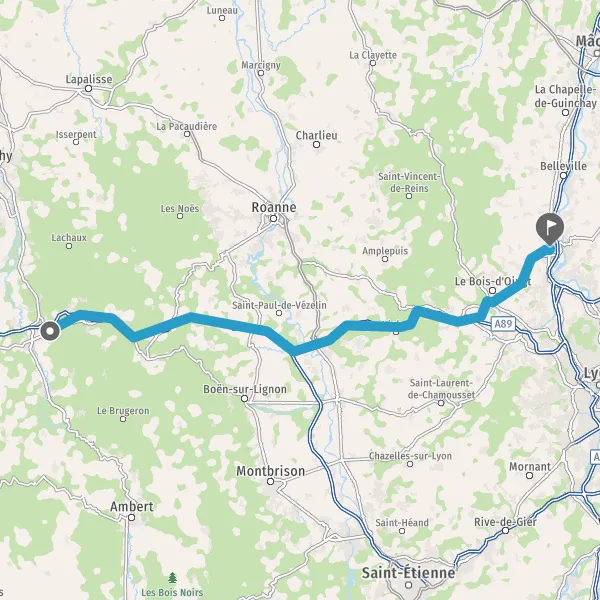 Prendre à droite et rejoindre A89. Continuer sur 36 kilomètres