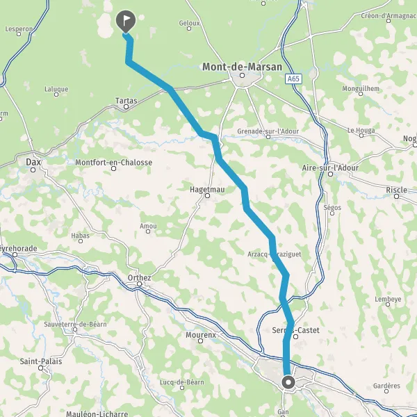 Au rond-point, prendre la 3ème sortie sur D40 (Route d'Arzacq) et continuer sur 14 kilomètres