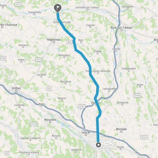 Au rond-point, prendre la 3ème sortie sur D40 (Route d'Arzacq) et continuer sur 14 kilomètres