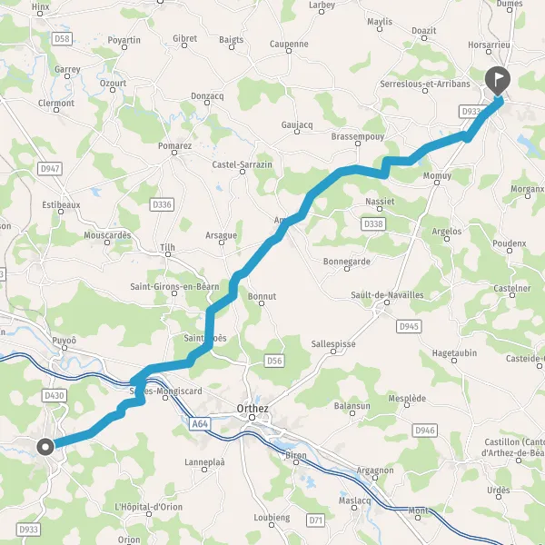 Au rond-point, prendre la 2ème sortie sur D933 (Route d'Orthez) et continuer sur 8,3 kilomètres