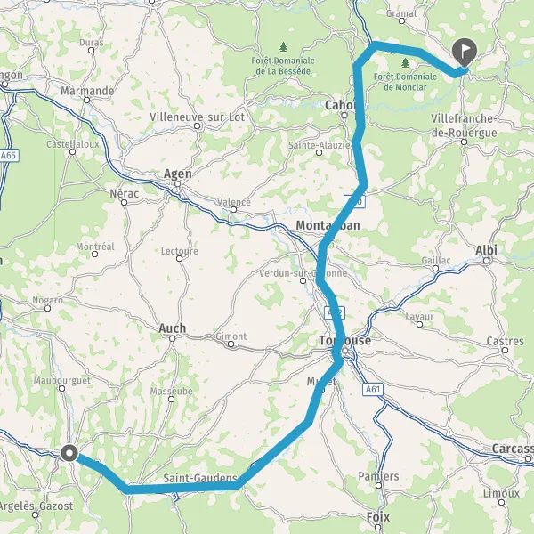 Prendre à droite et rejoindre A62. Continuer sur 33 kilomètres