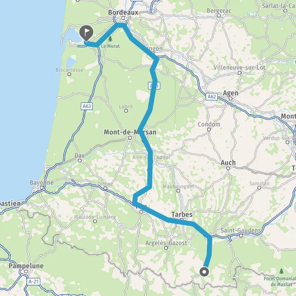 Prendre à droite et rejoindre A63. Continuer sur 25 kilomètres