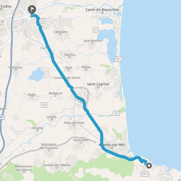 Au rond-point, prendre la 1ère sortie sur D22c (Route d'Elne) et continuer sur 900 mètres