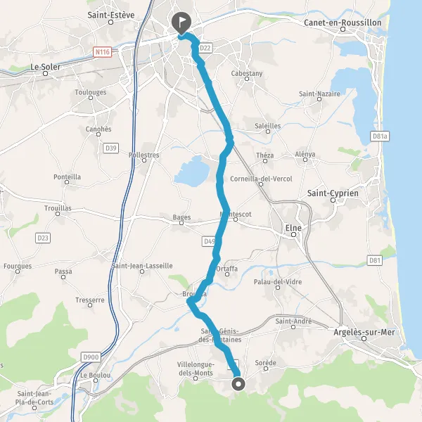 Au rond-point, prendre la 1ère sortie sur D22c (Route d'Elne) et continuer sur 900 mètres