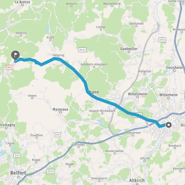 Au rond-point, prendre la 1ère sortie sur E512 D1066 (Route de Mulhouse) et continuer sur 3,8 kilomètres