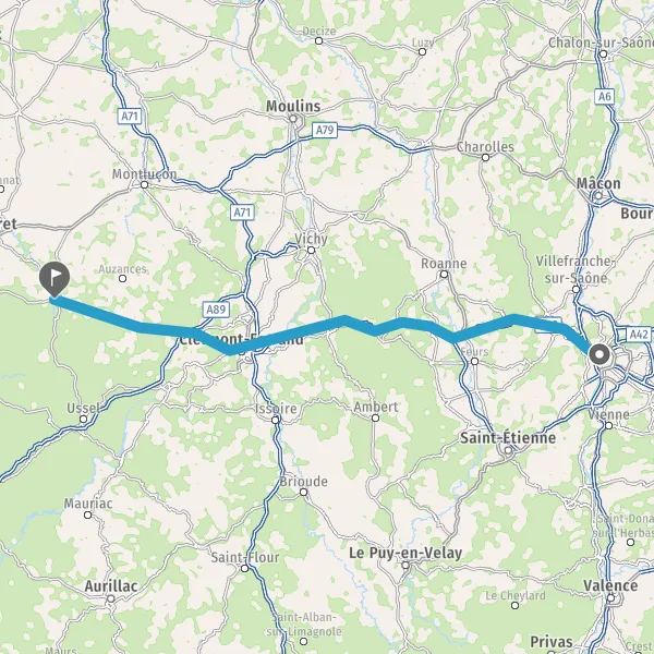 Prendre à droite et rejoindre A89. Continuer sur 55 kilomètres