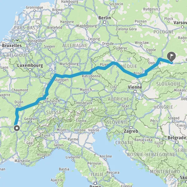 Itinéraire en voiture de Lyon 69001-69009 à Cracovie 30-001-32-125 Petite Pologne (Pologne)
